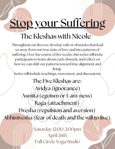 Throughout our lives we develop veils or obstacles that lead us away from our true state of love and into patterns of suffering. Over the course of five weeks, this series will invite participants to learn about each obstacle and reflect on how we can shift our patterns toward true alignment and living.